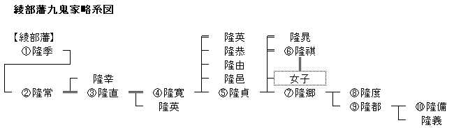 丹波綾部藩九鬼家は、志摩鳥羽藩主 九鬼守隆の三男隆季からはじまる。父の遺領を弟久隆(長兄良隆の養子)が相続したことから家督争いとなり、幕府の裁定によって分割相続となった。丹波国内で二万石を与えられたが、1661年に五百石を弟隆重に分与したため一万九千五百石を領した。