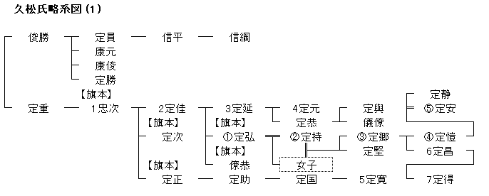 久松忠次の二男定次からはじまる。定次は徳川家康に近侍し、のちに蔵米二百俵を賜り、秀忠に仕えて大坂両陣に供奉した。二代定久は定次の長男で御鷹匠頭をつとめた。その子三代定矩も御鷹匠をつとめ、1661年に蔵米百俵を加えられ、御納戸番などをつとめ、2回の加増があり三百俵となった。1709年に月光院方の広敷番頭となった。