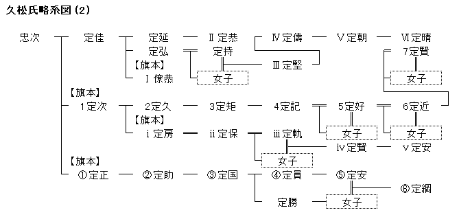 久松定次の二男定房からはじまる久松太郎左衛門家の分家。定房は、1649年に御留守居番の与力に加えれその子定保も同じ職を継いだ。1715年に表御右筆となった。現米八十石。三代定軌は医家本康徳亮の二男で、定保の婿養子なって相続した。